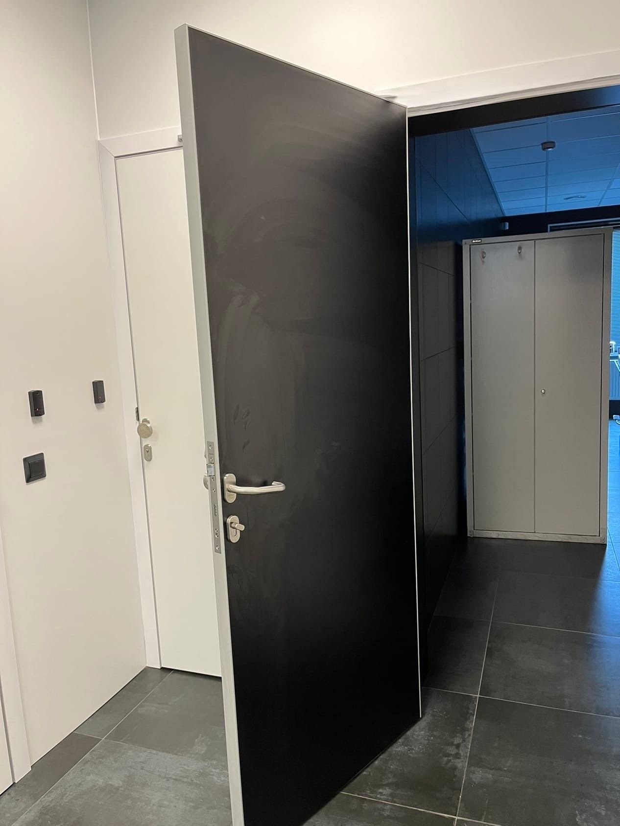 Алюминиевая телескопическая коробка с фрезерованием петель толщиной 3 мм из нержавеющей стали и двумя подшипниками. Три петли на коробке. Жесткий конструкционный профиль коробки. Окраска порошковой краской в цвет дверного полотна